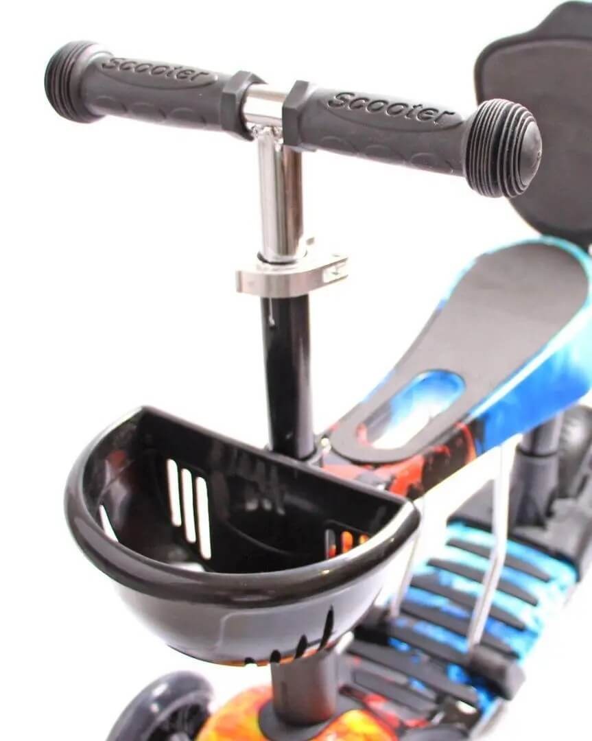 Трехколесный детский самокат беговел 5 в 1, Огонь и лед, с сидением, родительской ручкой, корзинкой, светящимися колесами