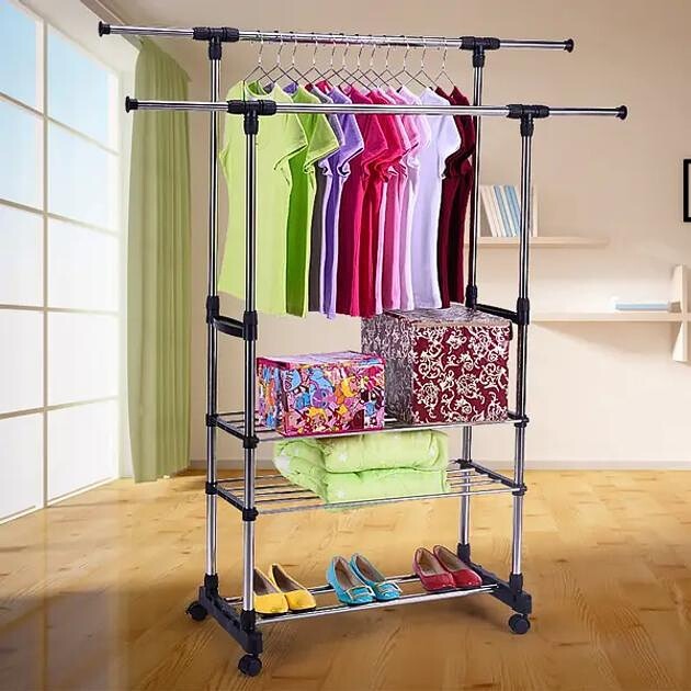 Телескопическая вешалка для одежды с полками для обуви облегчает не только организацию гардероба, но благодаря современному дизайну со вкусом выглядит в каждой комнате. Вешалка помогает поддерживать порядок. Стойка также имеет 4 больших полки для одежды, обуви или других вещей.