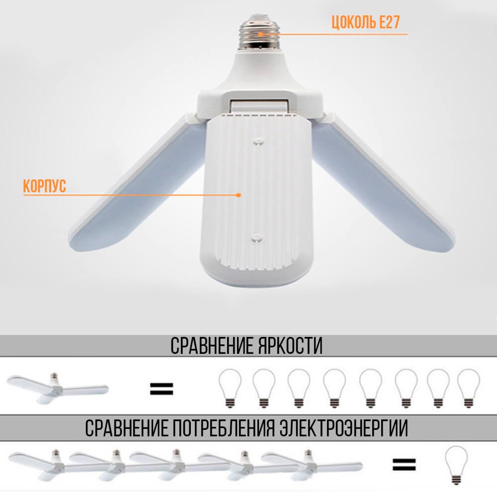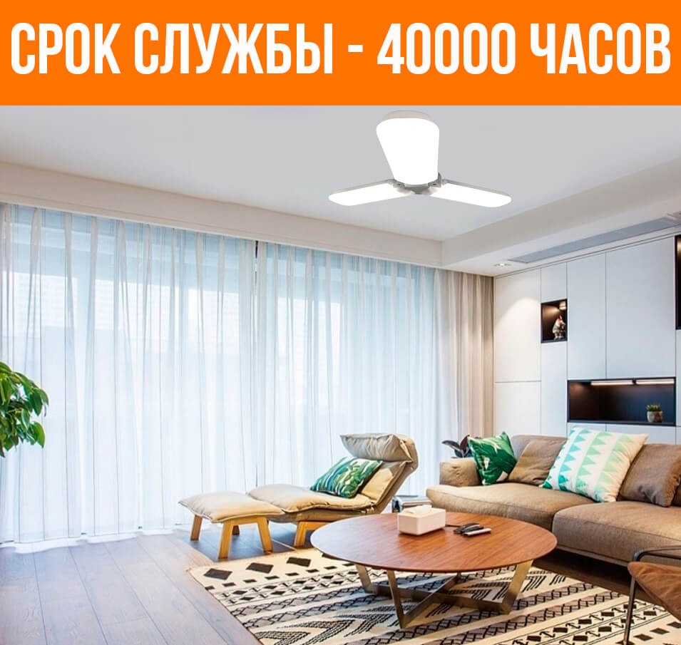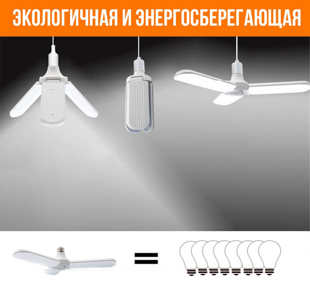 Помимо оригинальной конструкции, светодиодная лампа экологичная и энергосберегающая, срок службы которой составляет 40000 часов. Все лопасти лампы могут быть сложены на 90 градусов. Лапму легко хранить, когда она не используется.