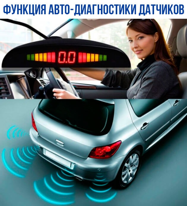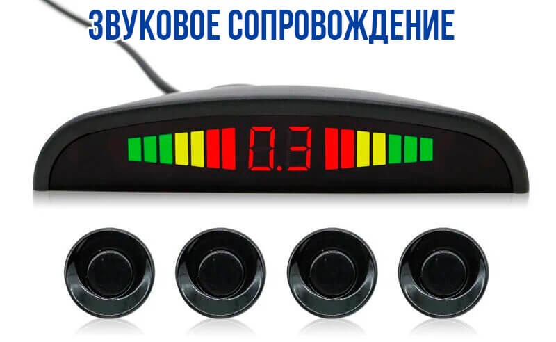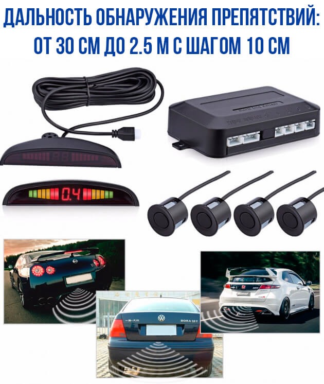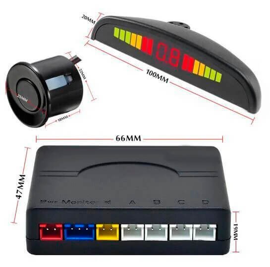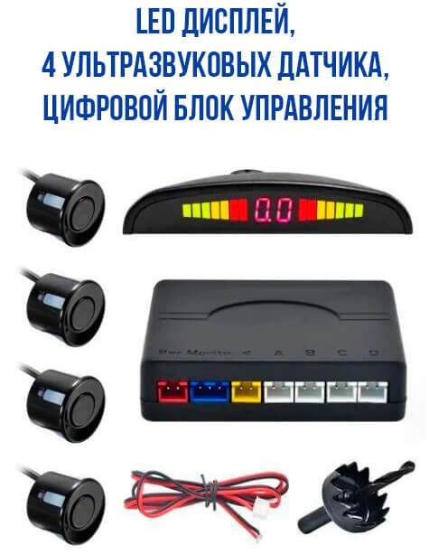 Парковочная система состоит из ультразвуковых 4 датчиков, цифрового блока управления и LED дисплея. Система оценивает расстояние между автомобилем и препятствием, находящимся напротив ультразвуковых датчиков, которые установлены на заднем бампере автомобиля.