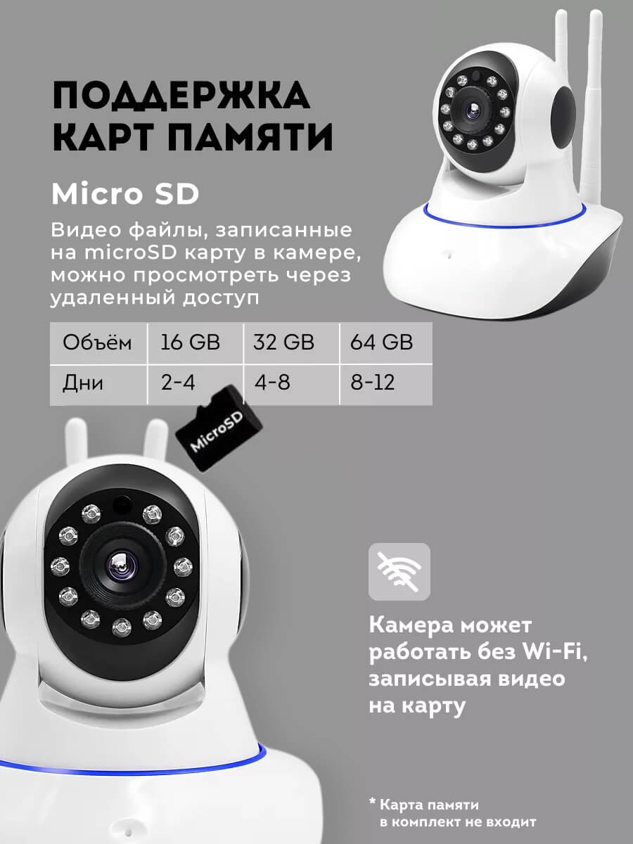 Данная модель камеры может вести запись видео при отключении интернета. Она будет вести запись на установленную SD карту, макс. 64Gb.