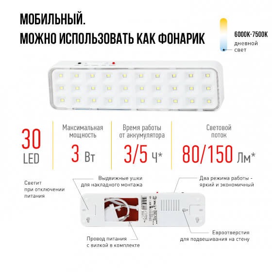 Применяется для аварийного освещения в случае общего отключения электрической энергии в здании,доме и тд. Изделие имеет компактные размеры, легкий пластиковый корпус, встроенный аккумулятор, экономичные и долговечные светодиодные лампы и переключатель режимов работы.
