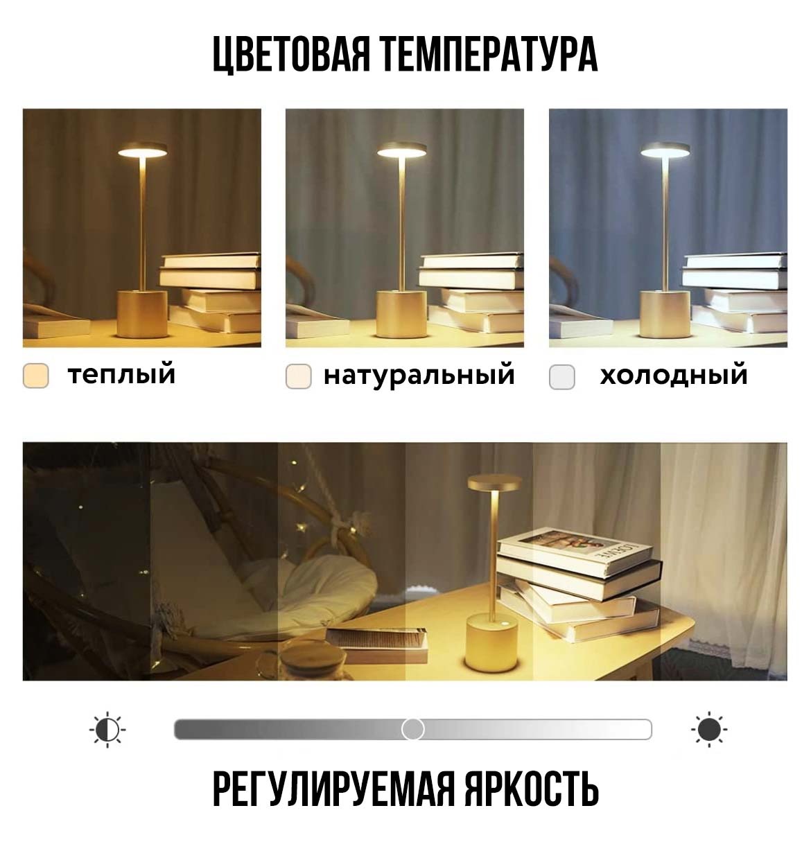 - Регулятор позволяет легко менять яркость легким нажатием на лампу;