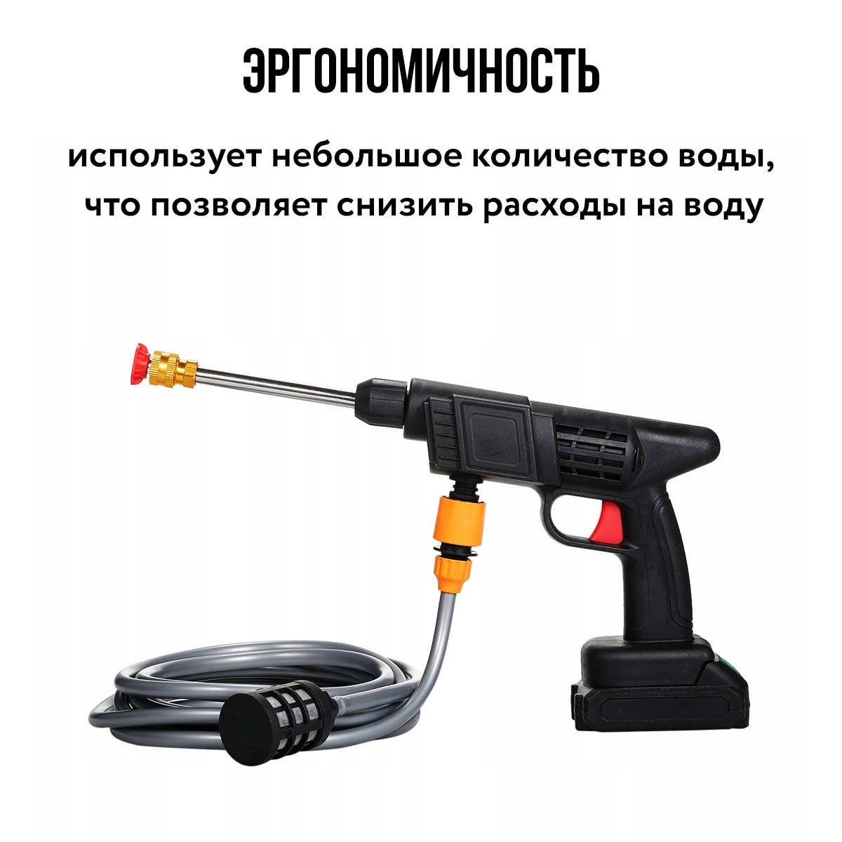 Мини мойка аккумуляторная имеет компактные размеры, что позволяет перевозить ее в любом багажнике. Для зарядки аккумулятора в комплекте предусмотрено зарядное устройство с индикацией. Мойкой буквально можно пользоваться в полевых условиях, то есть в условиях полного отсутствия электричества и воды, поскольку для работы мини мойки необходим заряженный аккумулятор и любая емкость с водой будь то канистра или ведро, насос сам втянет воду из емкости. В комплект входит две быстро съемные насадки - распылителя, одна из них дает узконаправленную струю - предназначена для сильных загрязнений, вторая насадка дает плоскую струю треугольной формы и используется для смыва незначительных загрязнений или смыва активной пены, автошампуня с кузова автомобиля. В свою очередь пену или шампунь можно нанести на кузов с помощью емкости с форсункой (в комплекте поставки), которая также быстро ставится и снимается с мини мойки