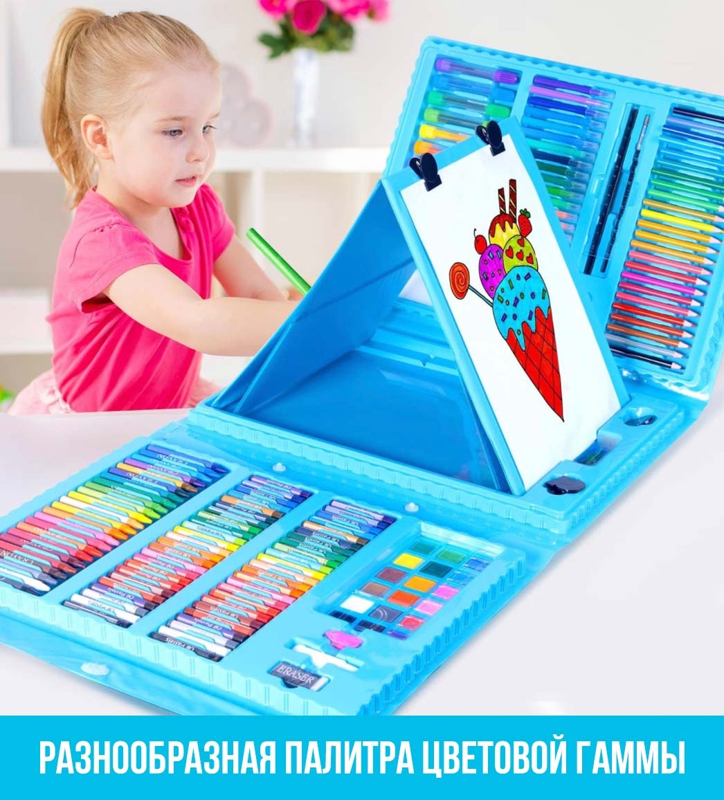 Детский набор для рисования на 208 предметов - прекрасный подарок для ребёнка. Любовь к различным аксессуарам для рисования, раскрашивания и отражения собственных фантазий на бумаге, проявляется у всех детей, начиная с самого юного возраста. Чемоданчик в виде раскладного кейса продуман до мелочей. Он имеет ячейки, которые хранят в себе все самое необходимое для маленького художника.