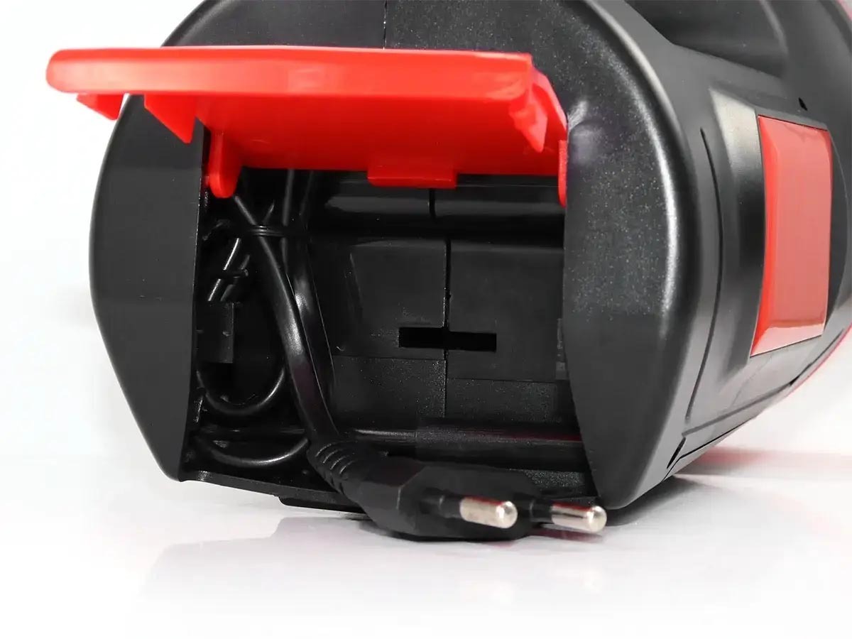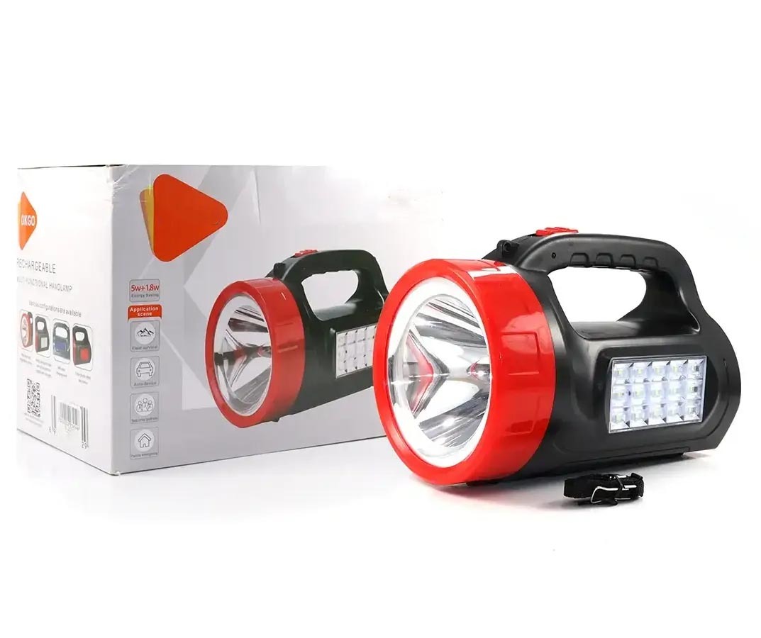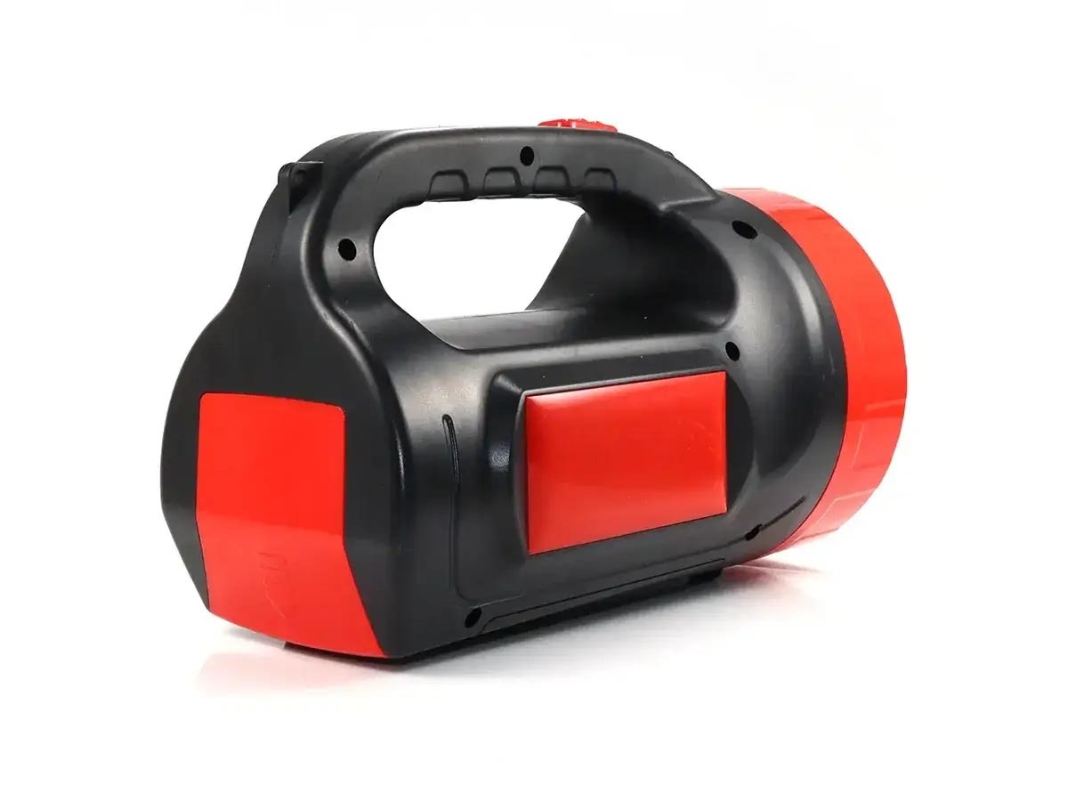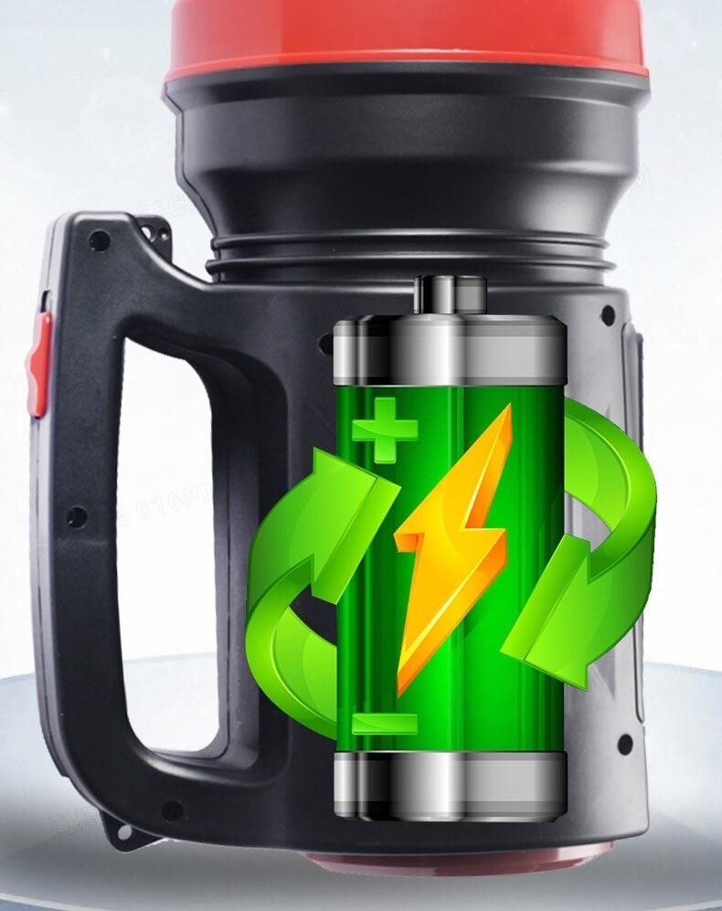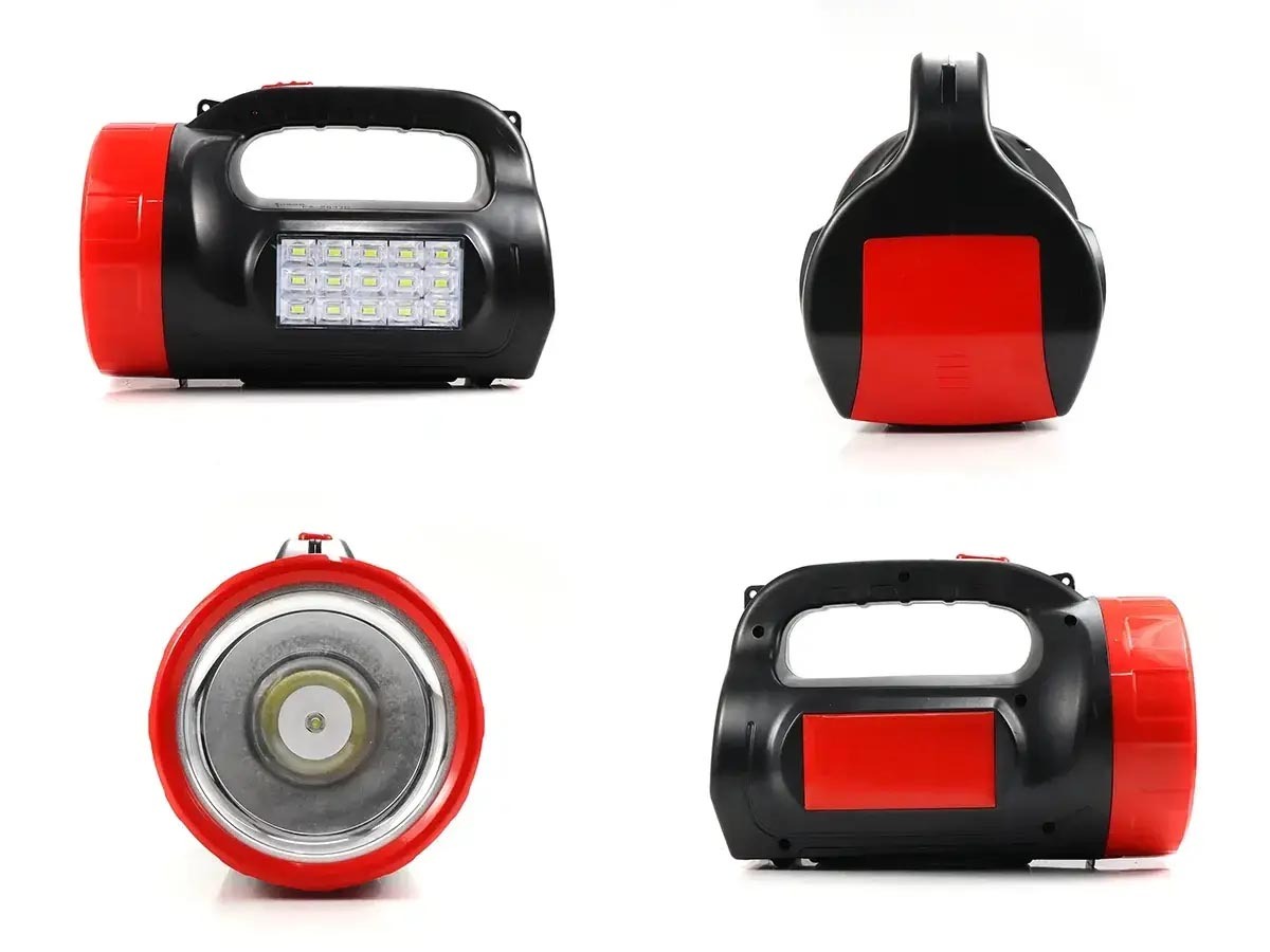 Многофункциональный, перезаряжаемый, поисковый, ручной фонарь высокой мощности. Большая емкость аккумулятора позволяет использовать его в качестве прожектора направленного и бокового света. Сбоку расположена солнечная панель как альтернативный источник зарядки фонаря. Влагозащищенный корпус изготовлен из ударопрочного пластика. В торце фонаря расположен специальный отсек для хранения сетевого шнура, что делает устройство более компактным при хранении. Также можно поставить фонарь и использовать в качестве настольной лампы. На корпусе есть держатель-ручка для удобства транспортировки и использования. При полном заряде батареи возможна непрерывная работа прожектора в течение 16 часов.