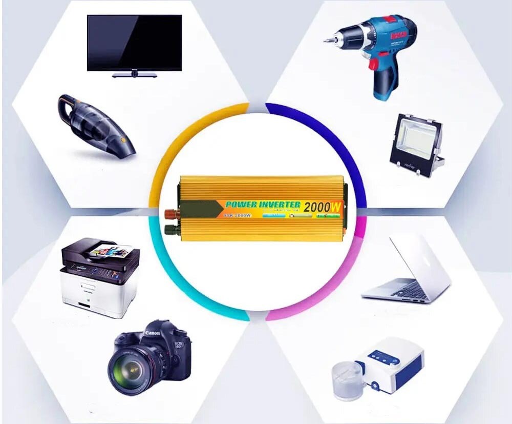 Преобразователь 24V-220V, мощностью 2000W – устройство, предназначенное для подключения и использования разнообразной бытовой техники, электроинструмента, ноутбука, телефона, различной видео и аудиотехники, а также других электроприборов в условиях, где нет сетевых источников питания.
