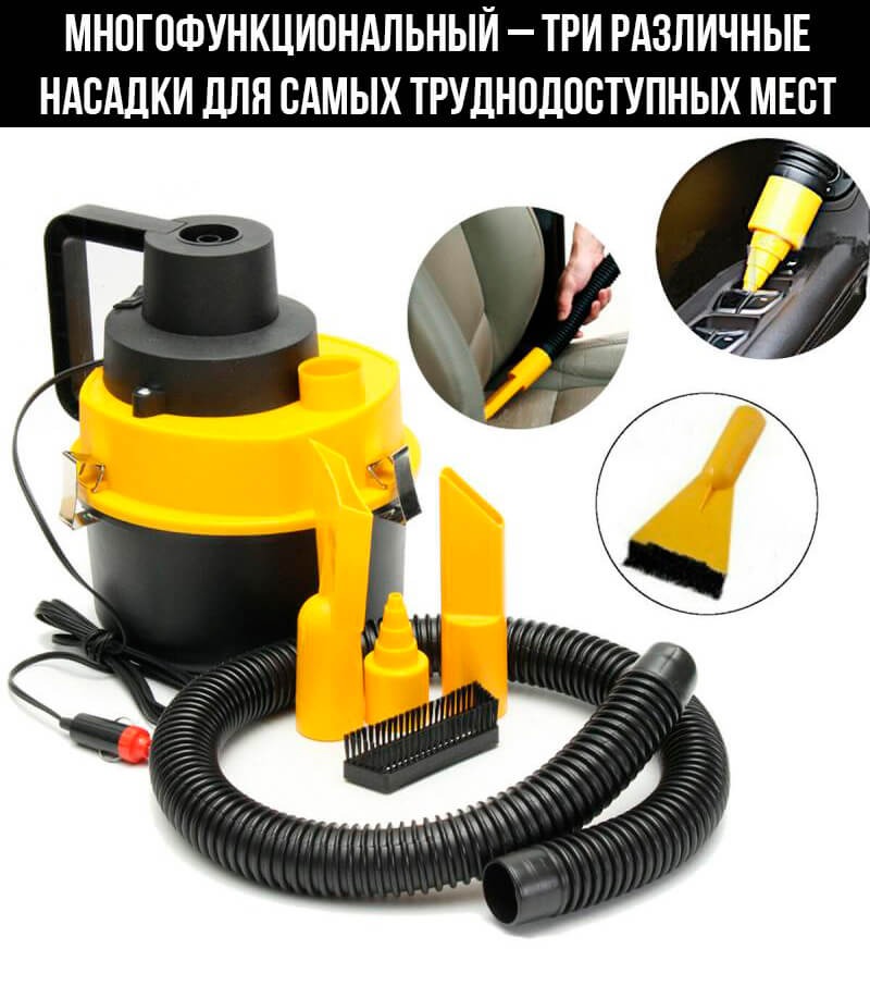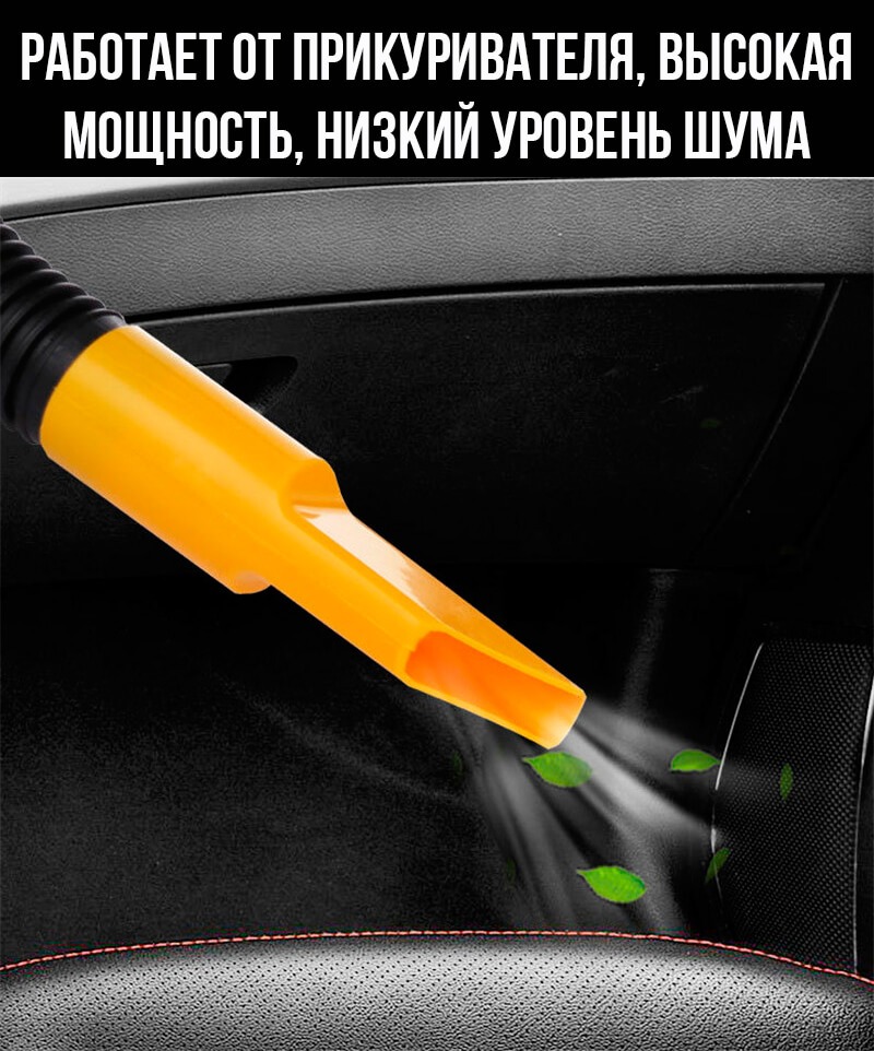 Мощный автомобильный пылесос идеально подходит для автомобилей, он быстро выбирает влажные разливы, сухие крошки, грязь и пыль. Позволяет быстро и качественно производить уборку в салоне и багажнике автомобиля. Вы без труда почистите автомобильные чехлы, обивку и другие поверхности. Входящие в комплект насадки уничтожат пыль в самых труднодоступных местах.