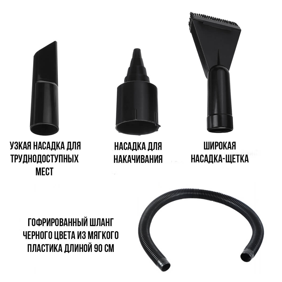 Большим преимуществом ручного пылесоса является наличие конусообразной насадки для накачивания различных предметов - матрасов, кругов, бассейнов и других необходимых на отдыхе вещей, что автоматически превращает его в автомобильный насос. Насадка выполнена ступенчатой для возможности использования для различных предметов и диаметров отверстий.