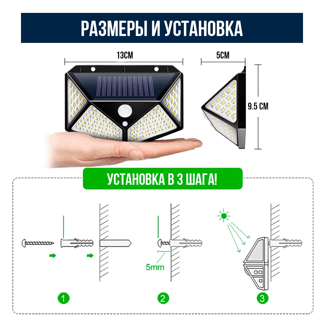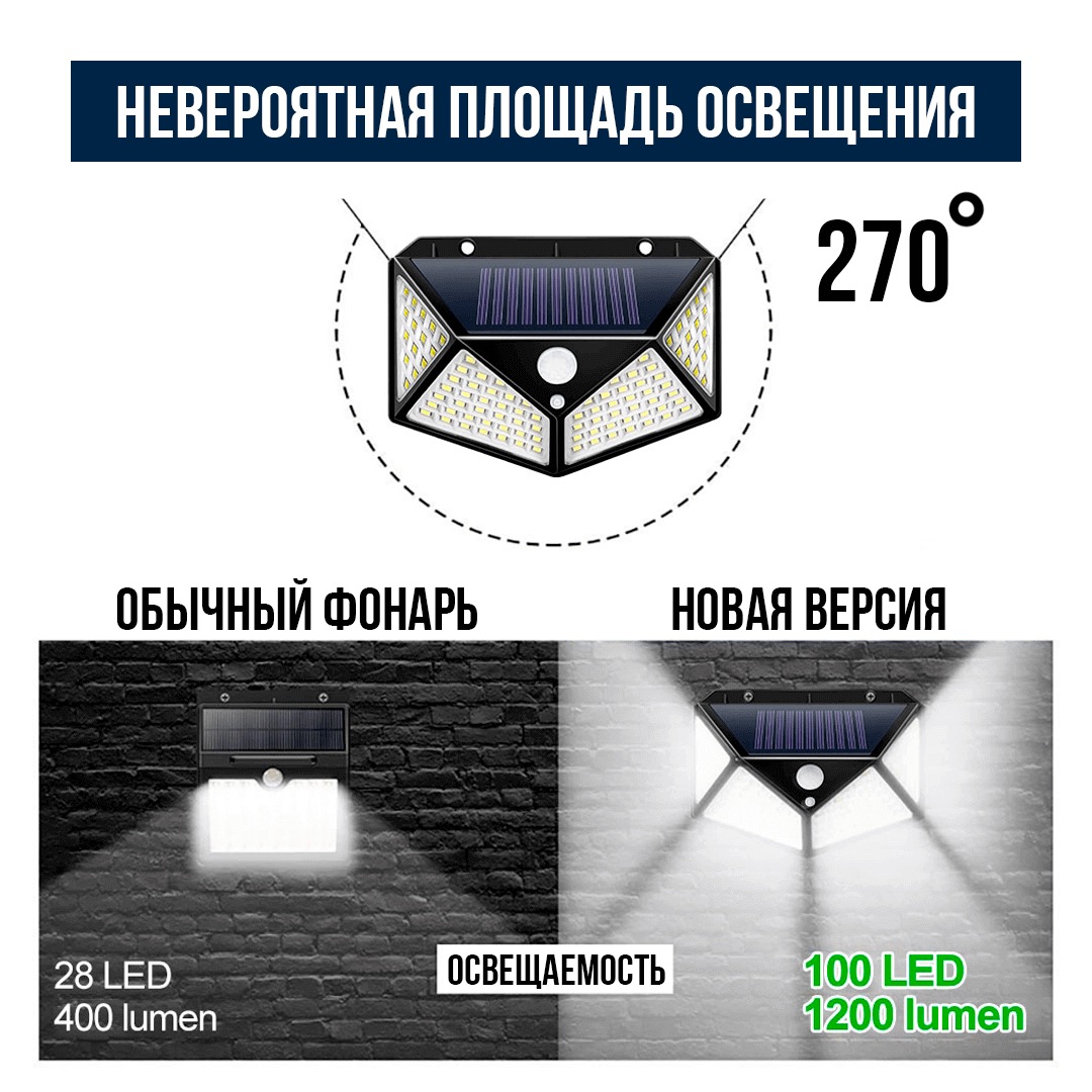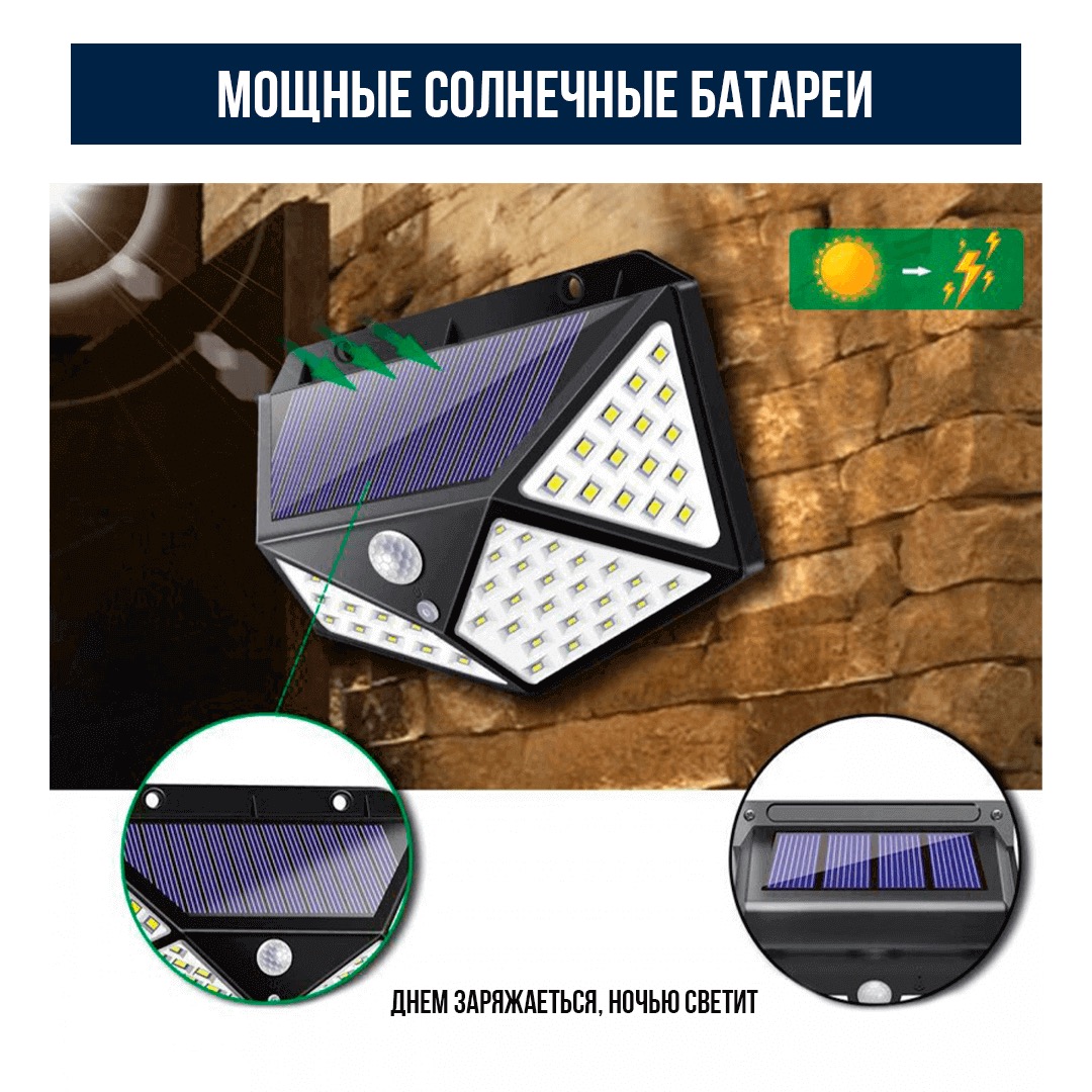 Фонарь-прожектор на солнечной батарее с датчиком движения, 100 LED, настенный, черный
