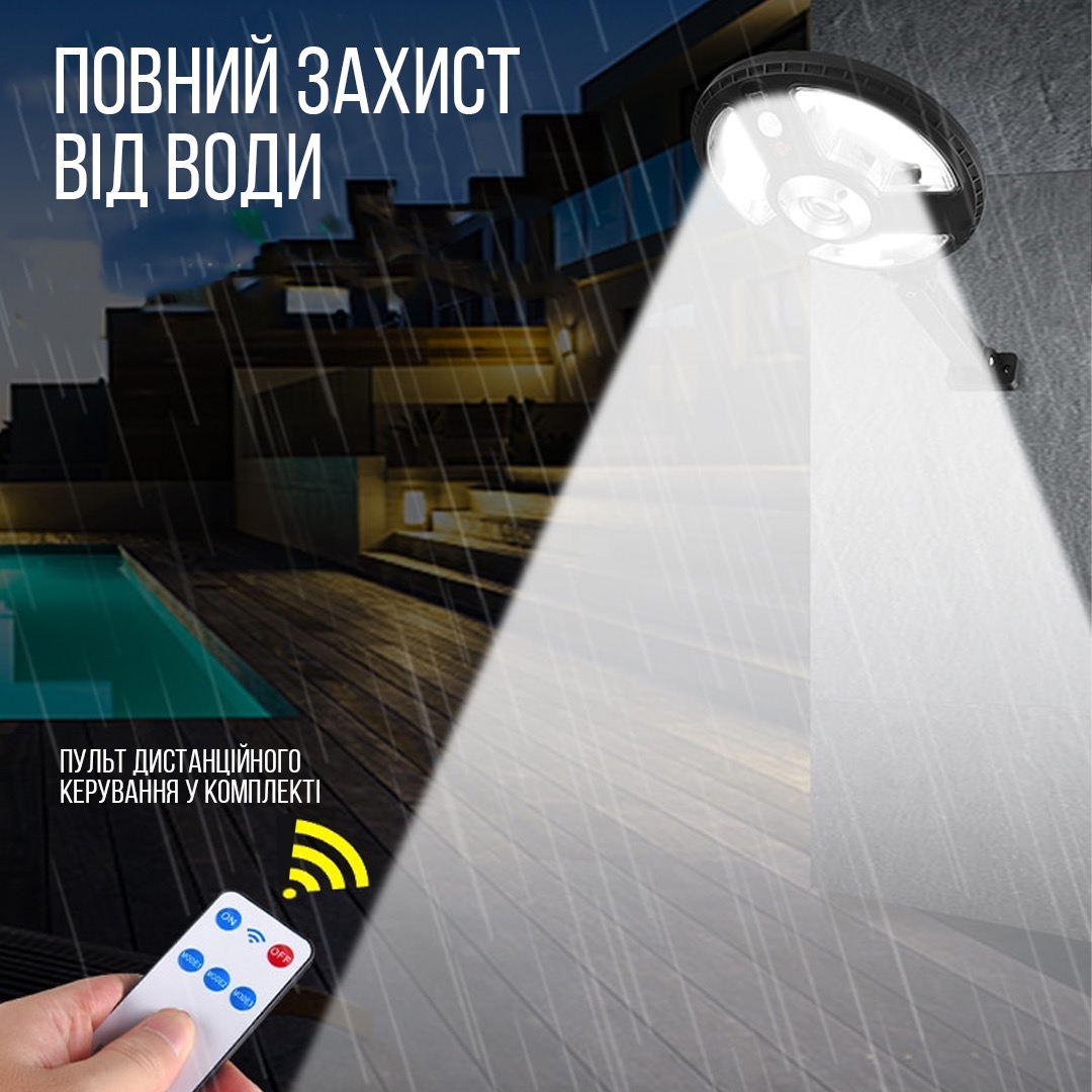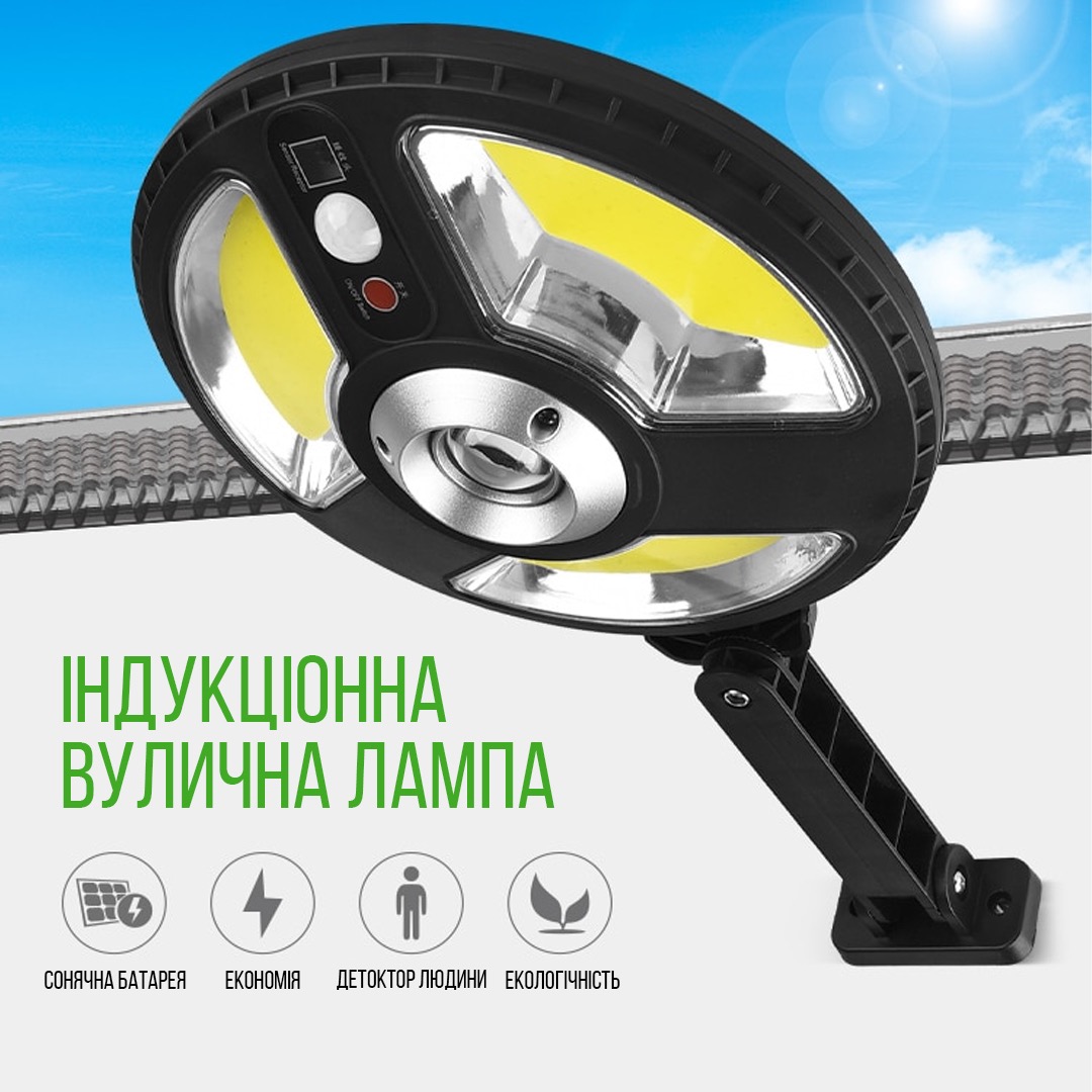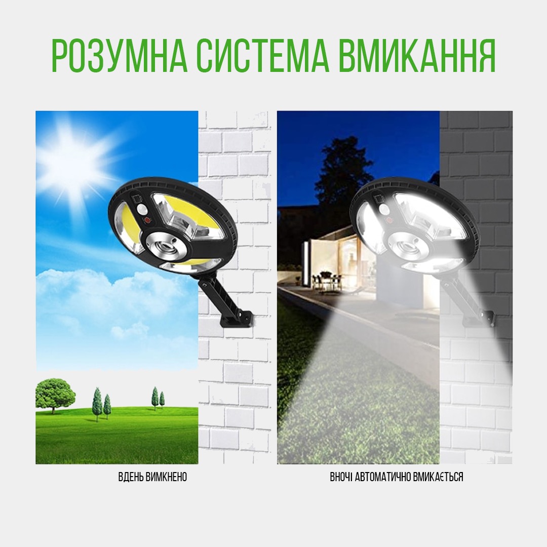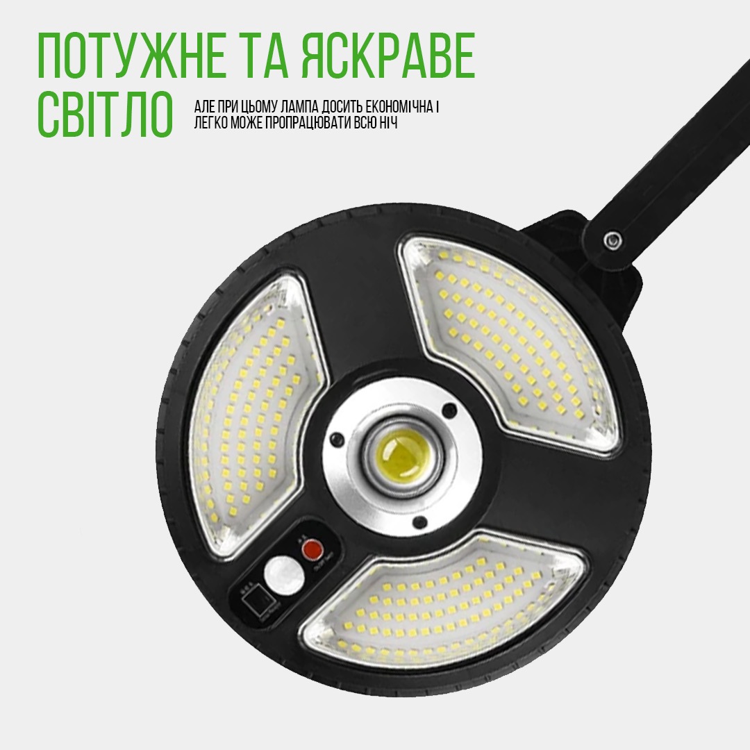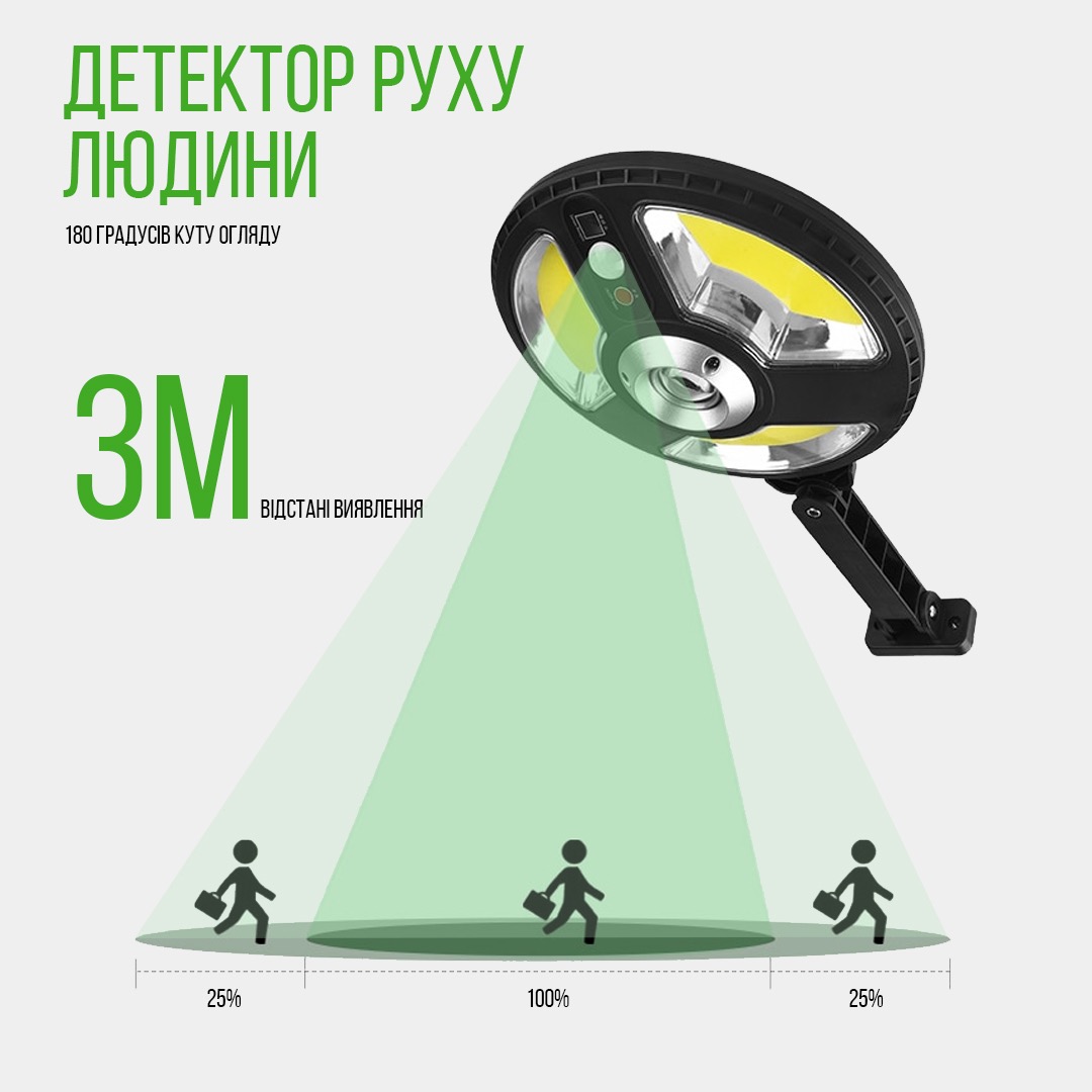 Призначений для автономного освітлення території. Світильник працює від сонячних батарей і тому Вам не потрібно турбуватися про його зарядці або підключенні до мережі. Датчик руху спрацьовує з відстані 7-9 метрів, при куті огляду 120 градусів. Час роботи при повному заряді акумулятора до 1-2 дня. Вбудованих 3 режиму роботи (повний, 50% від потужності при неактивній роботі, 100% потужності в разі руху, 50% потужності).