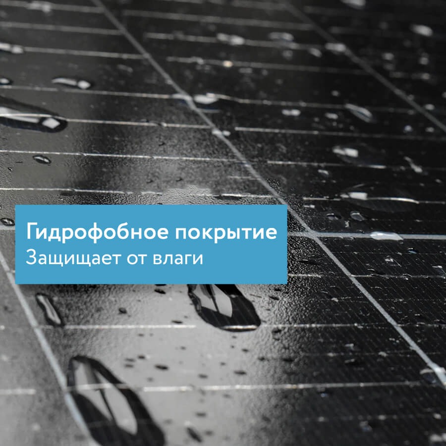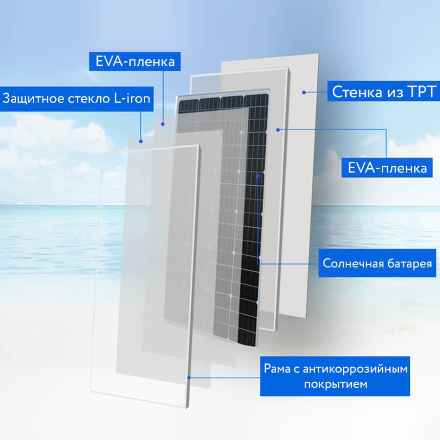 Устройство образовано из фотоэлементов с токопроводящими шинами в каждой ячейке. Благодаря технологии 5ВВ, панель устойчивее к перегреву, менее подвержена растрескиванию и появлению "горячих точек". Фотоэлементы расположены между подложкой из прочного ТРТ-пластика и закаленным прозрачным стеклом. Для прочности и герметичности конструкцию обрамляет алюминиевый коррозиестойкий профиль.