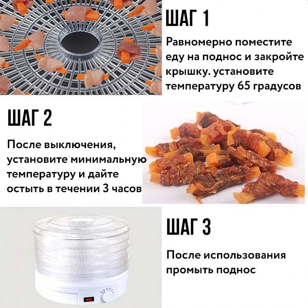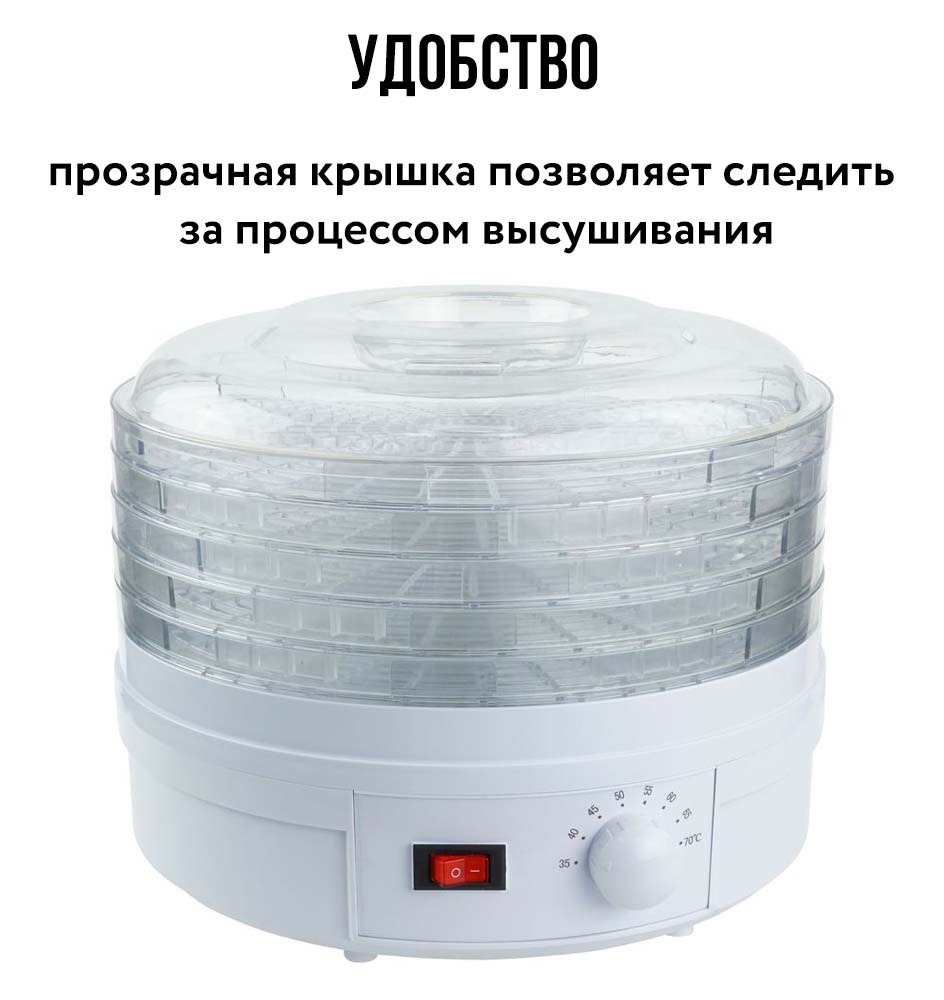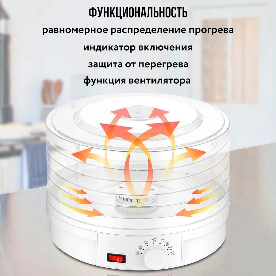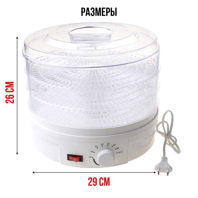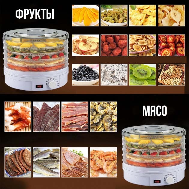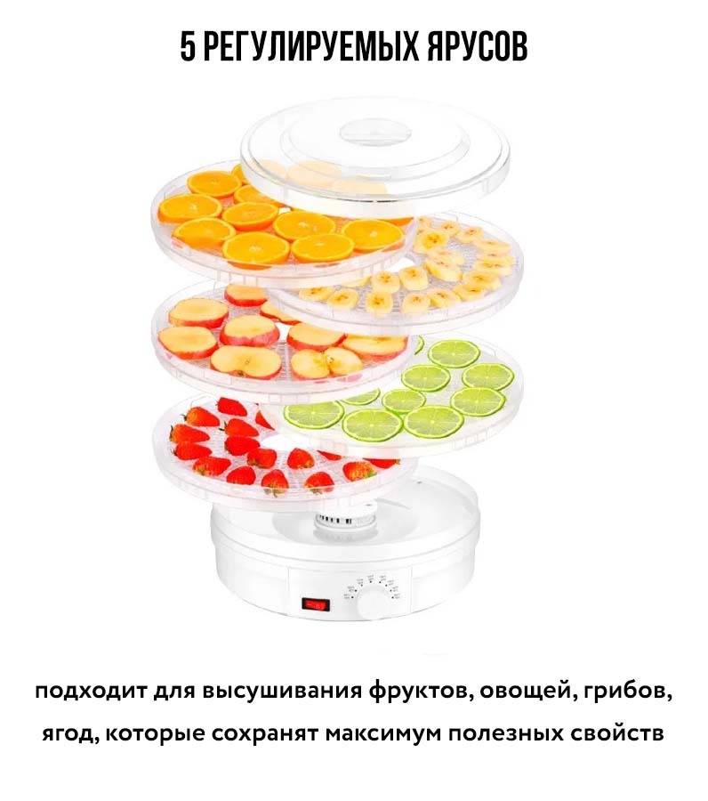 Имеет 5 регулируемых ярусов, на которые можно поместить большое количество продуктов различной формы и размера. Кроме того, она оснащена таймером и регулятором температуры, что позволяет настроить процесс сушки под свои потребности. В целом, сушарка  – это надежный и удобный инструмент, который поможет сохранить пользу и вкус ваших любимых продуктов.