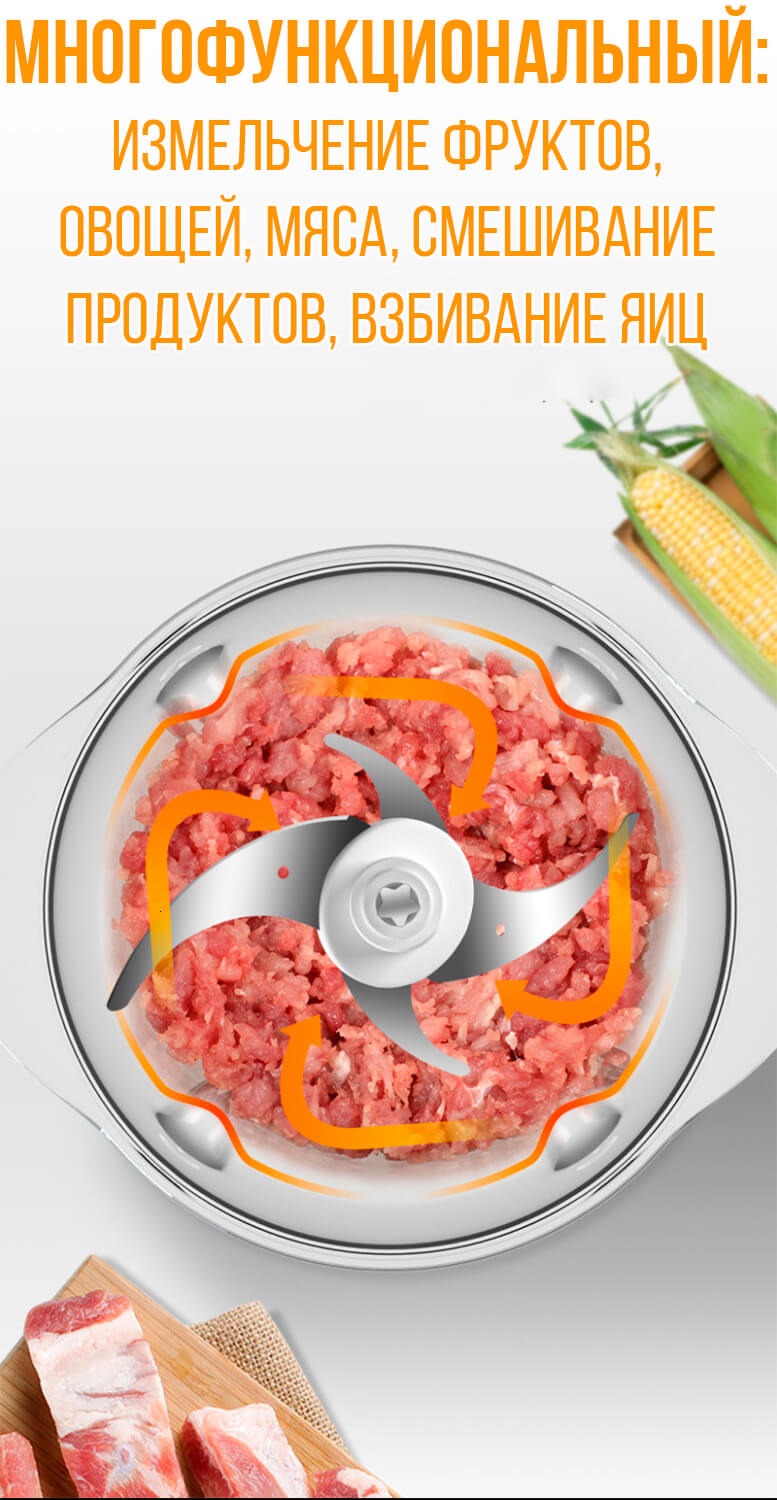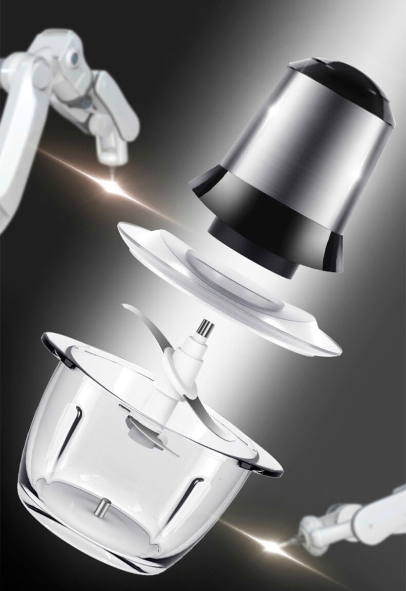 Измельчитель может справиться с любыми задачами. Он нарезает, измельчает, перемалывает и доводит ингредиенты до состояния пюре. Просто нажмите кнопку, и прибор за считанные секунды нарежет овощи, фрукты, сыр, мясо или орехи. Готовьте супы, салаты, соусы, детское питание, десерты, и даже коктейли! Измельчитель с двухъярусным лезвием обладает компактными размерами, поэтому он не займет много места у вас на кухне.