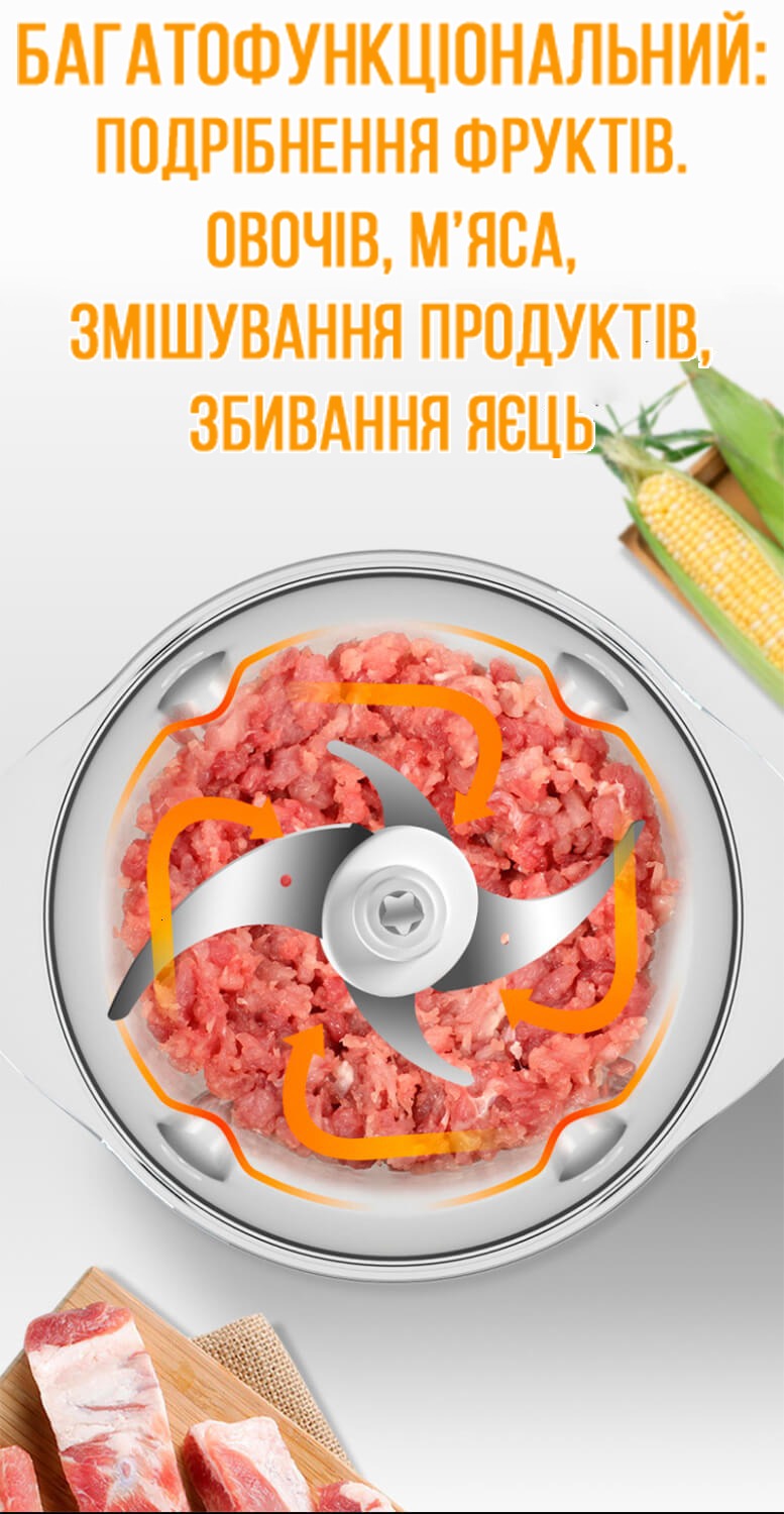 Подрібнювач може впоратися із будь-якими завданнями. Він нарізує, подрібнює, перемелює та доводить інгредієнти до стану пюре. Просто натисніть кнопку і прилад за лічені секунди наріже овочі, фрукти, сир, м'ясо або горіхи. Готуйте супи, салати, соуси, дитяче харчування, десерти і навіть коктейлі! Подрібнювач з двоярусним лезом має компактні розміри, тому він не займе багато місця у вас на кухні.