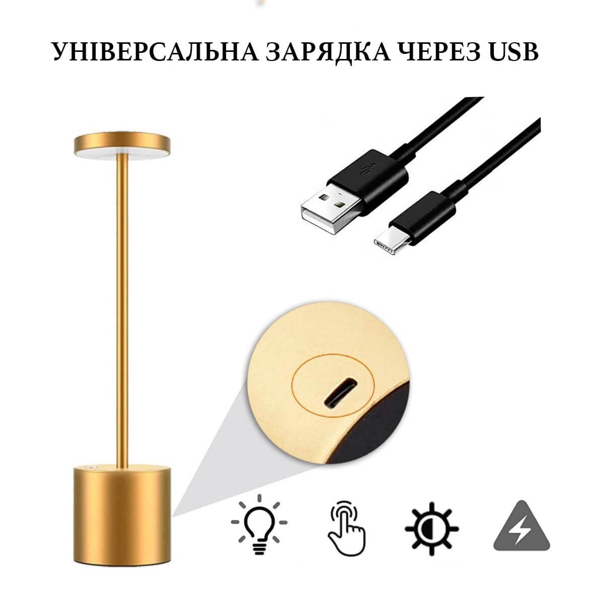 Виготовлена з алюмінієвого сплаву: лампа з живленням від акумулятора, універсальна зарядка через USB, може бути підключена до будь-якого USB-порту (включаючи ноутбук, комп'ютер, блок живлення телефону, павербанк тощо);