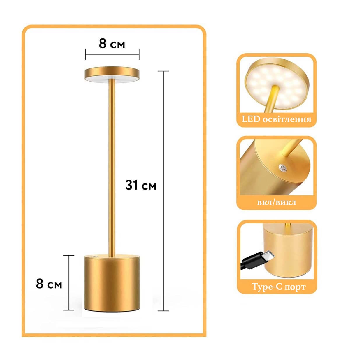 Ергономічний дизайн: круглі форми, освітлення на 360 градусів, корпус з алюмінієвого сплаву, стійкий до подряпин та міцний, екологічно чистий та низьке енергоспоживання, протиковзний дизайн основи, гладка та тонка металева ручка для надання стильному вигляду.
