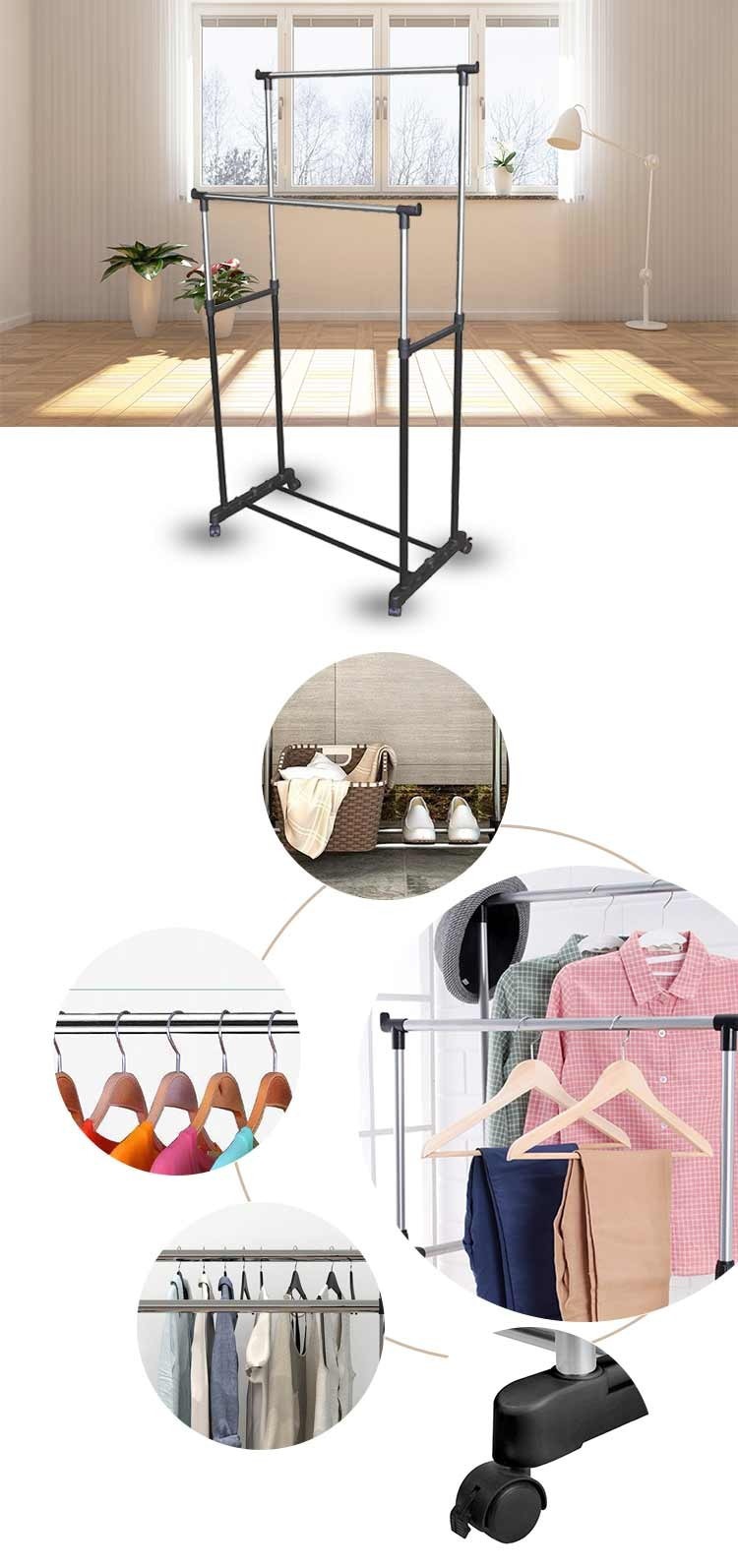 Стійка Double Pole Clother Hose виконана двоповерховою, для впорядкування і нормального, компактного, розміщення одягу на ній. Бічні поперечні планки зручні для розміщення на них, наприклад, випрасуваних штанів. Найкраще для стійки використовувати вішалки, так що одягу можна розмістити в рази більше.