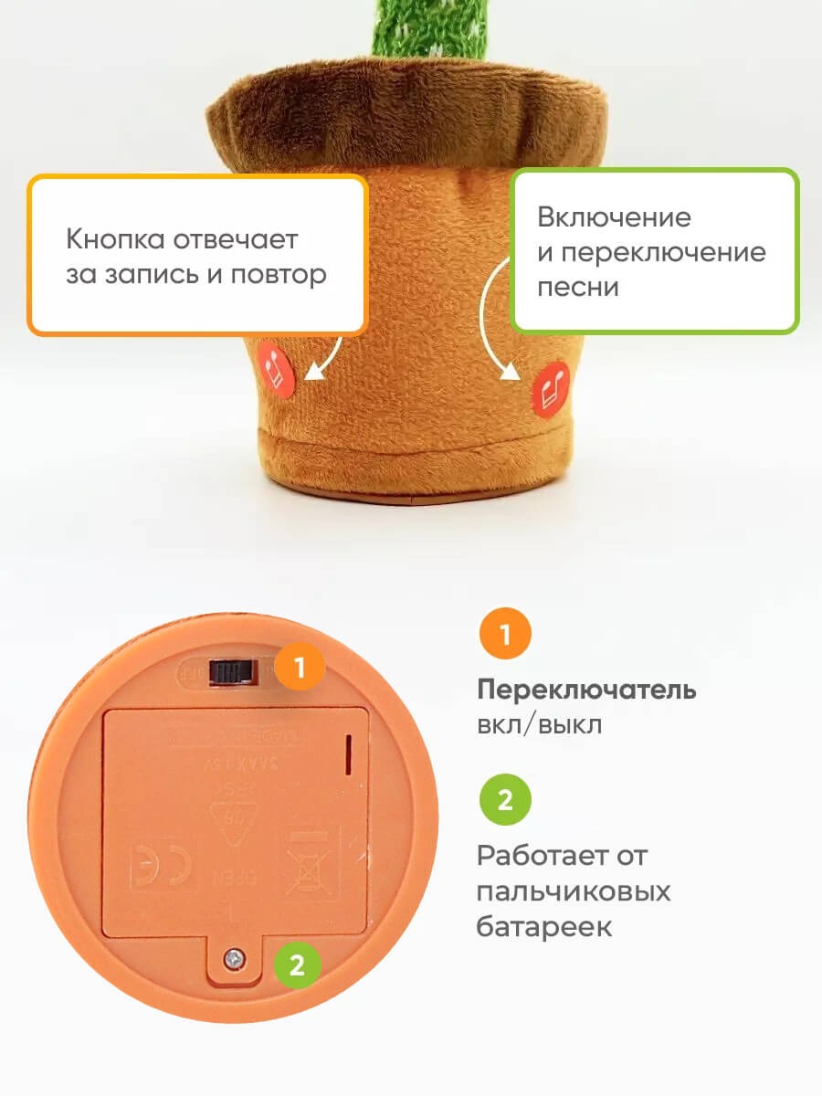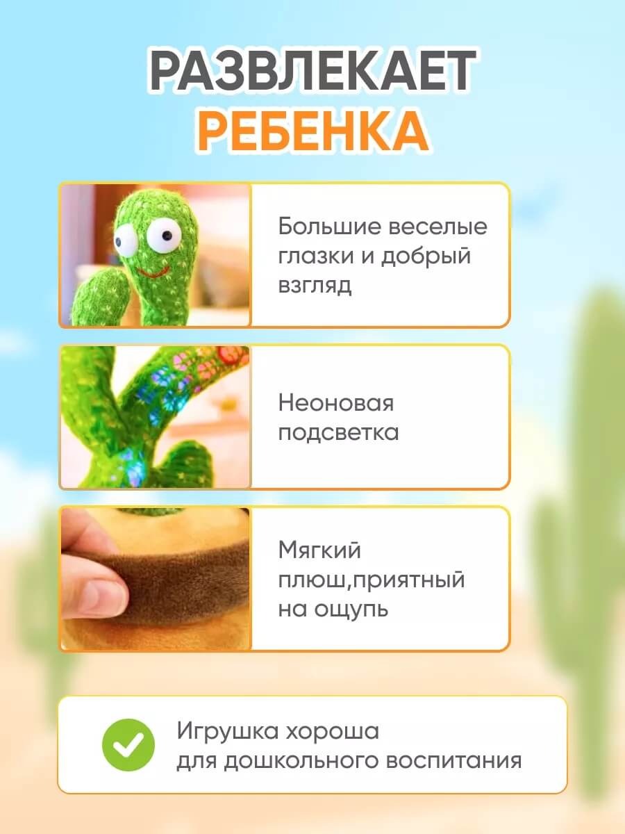 Поет 120 песен, танцует со светомузыкой и повторяет все звуки вокруг, что очень привлекает детей. Веселая музыка и танцы подходят для создания приятной атмосферы и подходят для вечеринок. Записывающее устройство в кактусе запишет любое ваше предложение, которое вы скажете рядом с танцующим кактусом, и через 1-2 секунды оно повторит ваши слова очень смешным голосом и утонченным танцем! Функция записи языка 10 секунд. Эта забавная милая игрушка имеет высоту 34 сантиметров.